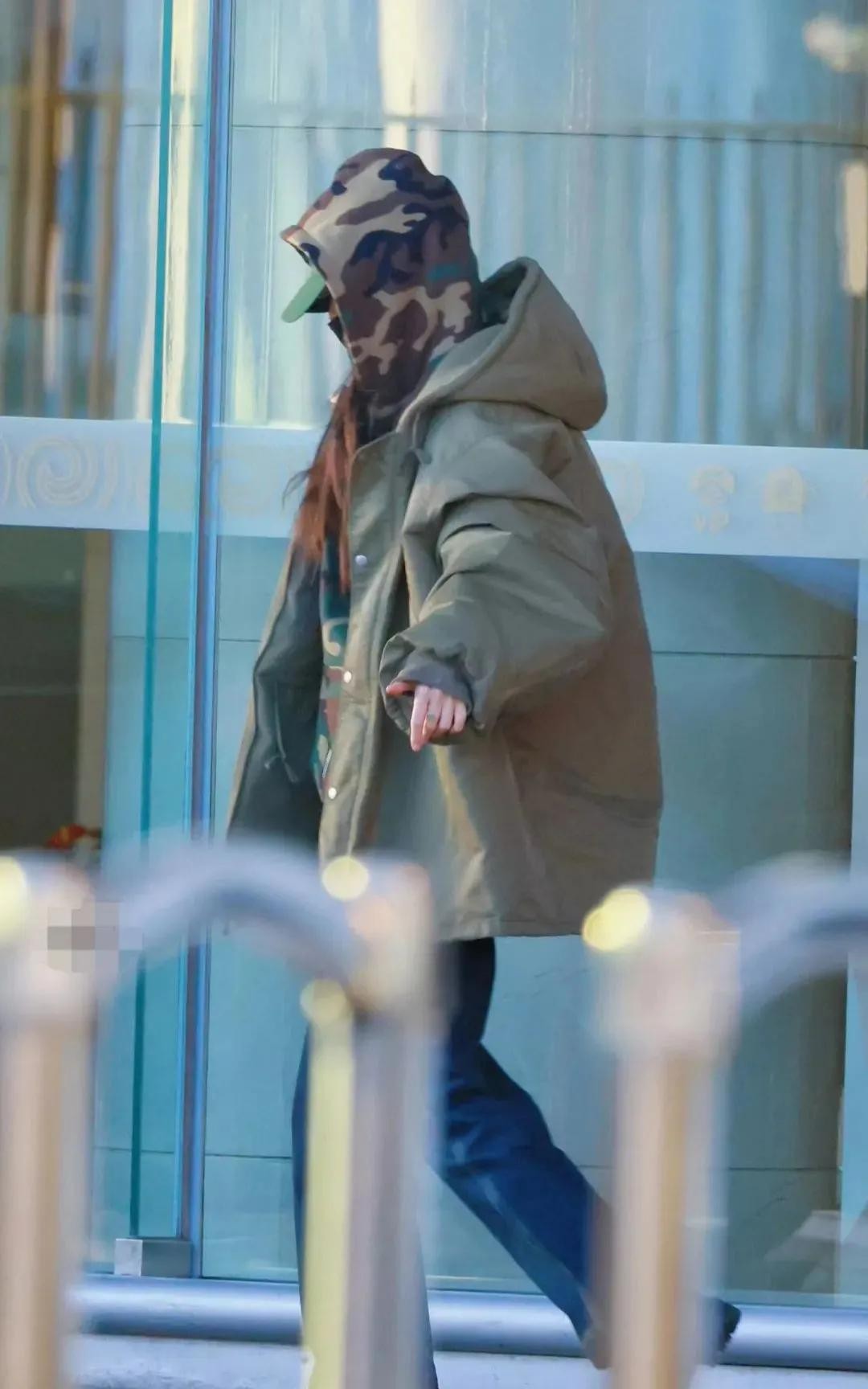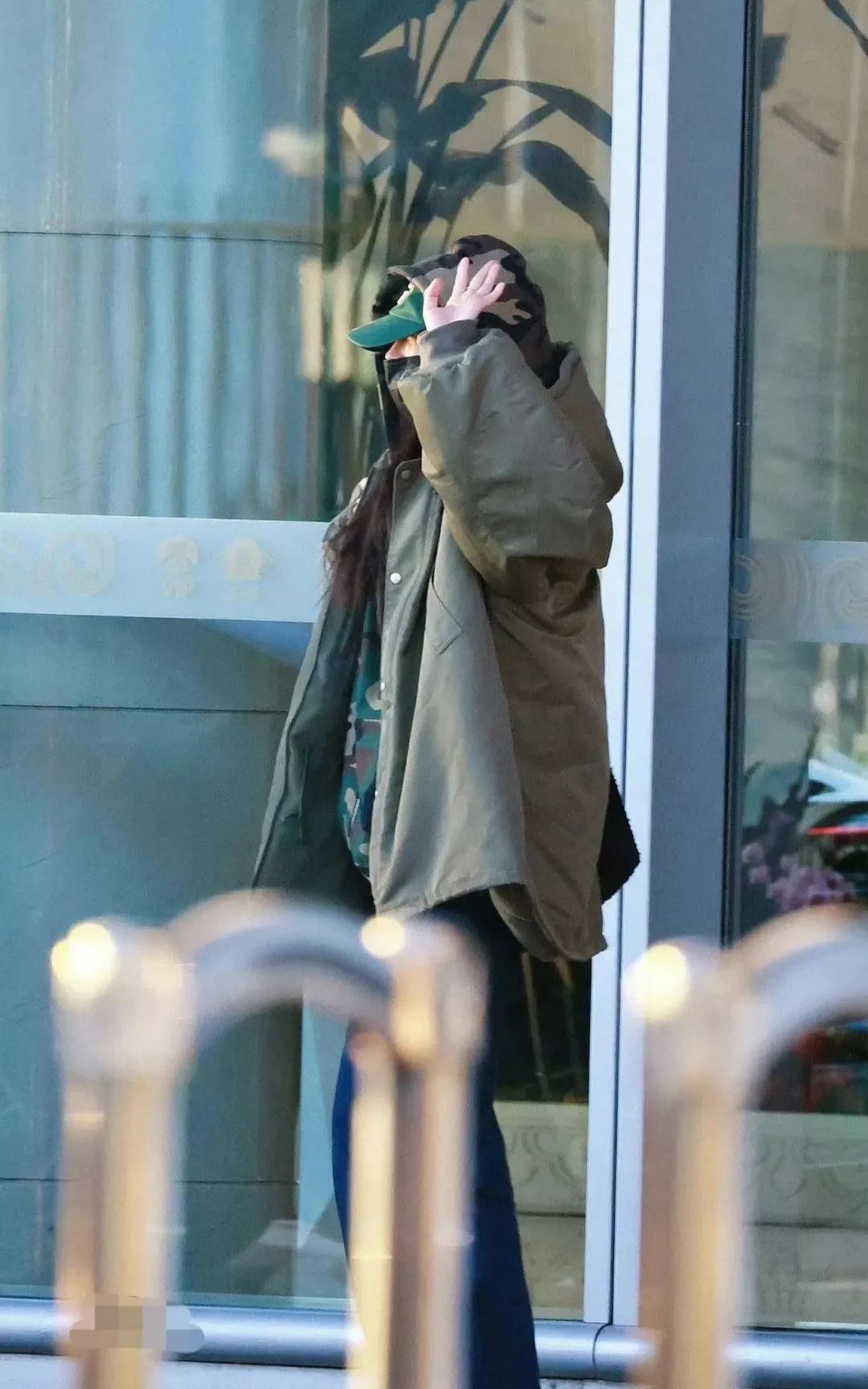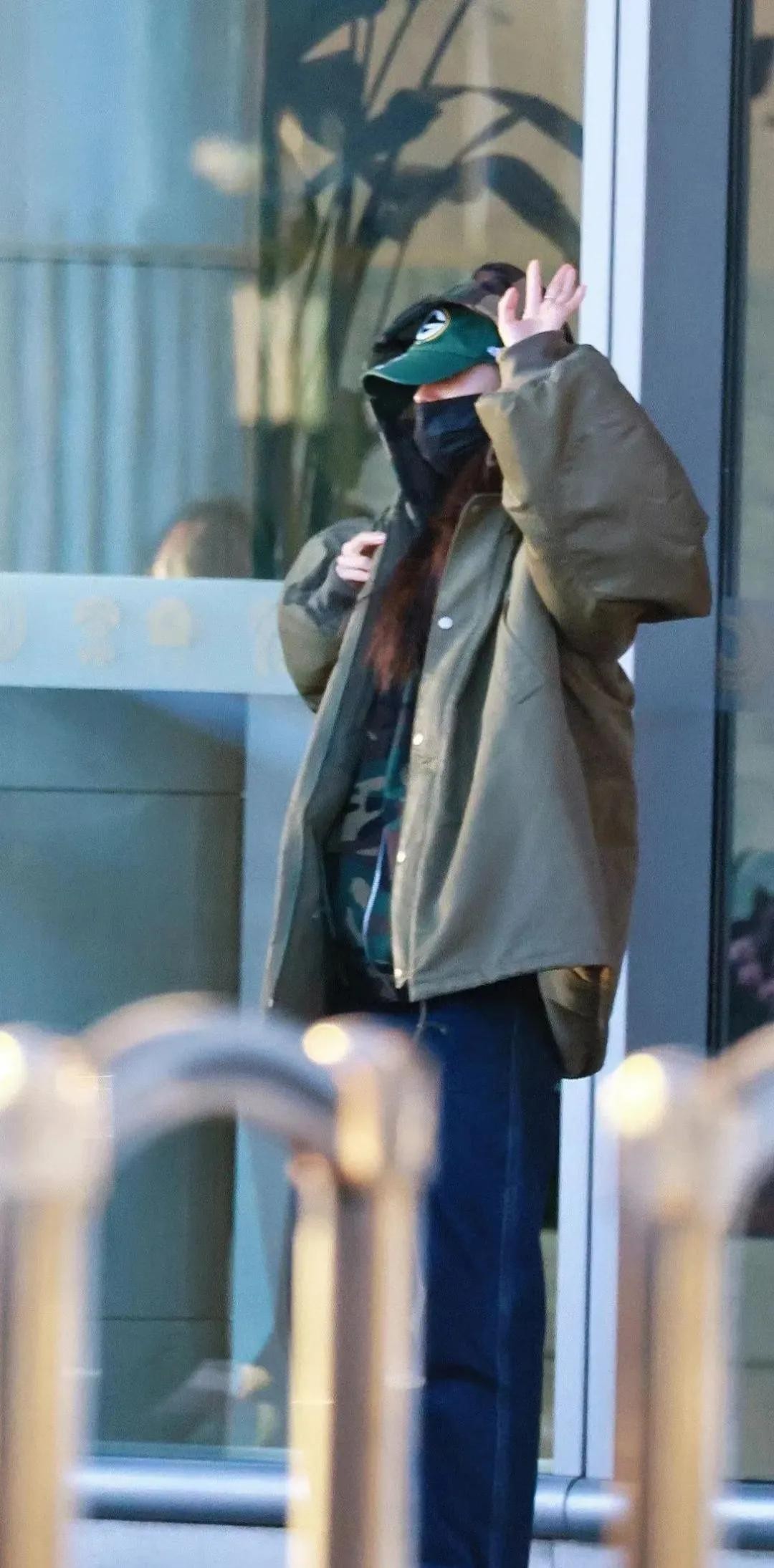 她随意披散着长发,有几分妩媚,有几分慵懒,她戴绿色棒球帽,叠戴迷彩服帽,黑色口罩,把自己遮挡得严严实实。