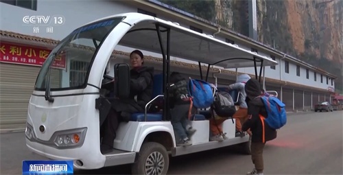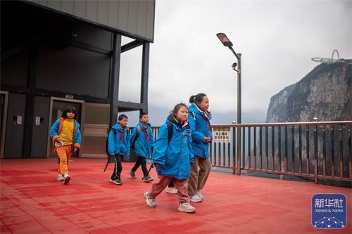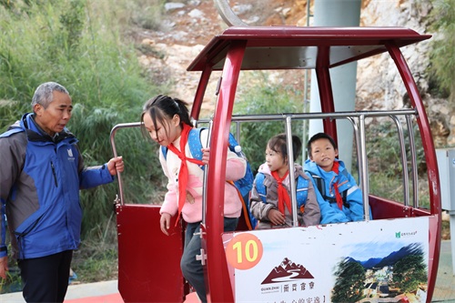 2月23日,云南省宣威市普立乡尼珠河村的小学生们走出观光电梯准备转乘缆车。