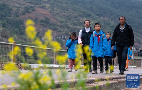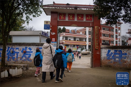 2月23日,云南省宣威市普立乡尼珠河村的小学生们抵达学校。
