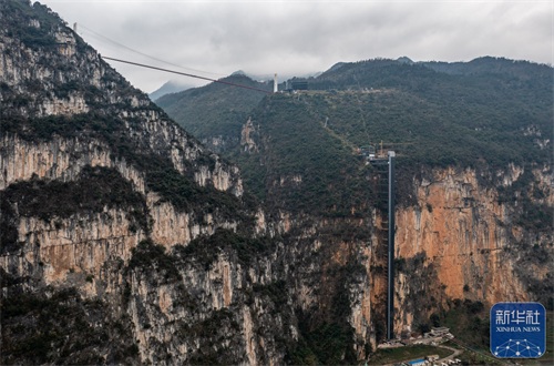 2月23日,云南省宣威市普立乡尼珠河大峡谷的观光电梯和缆车(无人机照片)。新华社记者 江文耀 摄
