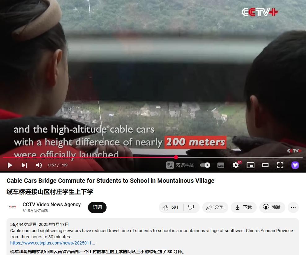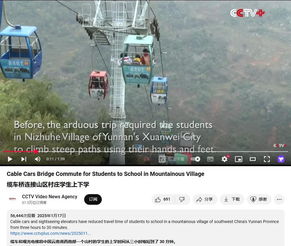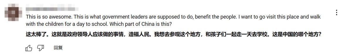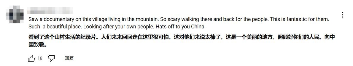 “我之前看过有关这座山区村落的纪录片,那里很偏僻也很落后,村里的老百姓要出去一趟还得在悬崖峭壁上爬上爬下,这太可怕了。现在看到那里发展起来了,村里的孩子们外出上学也有空中校车可以坐了,我为他们感到由衷高兴。这地方的风光其实很美。中国啊,请照顾好你的人民,向你致敬。”