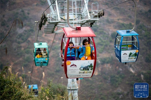 2月23日,云南省宣威市普立乡尼珠河村的小学生们乘坐空中缆车去学校。