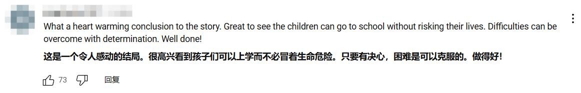“你的视频我看完了,结局很令人感动。看到孩子们可以不必冒着生命危险,高高兴兴上学去,平平安安回家来,我为他们感到由衷地高兴。有志者,事竟成。中国这事干得漂亮!”