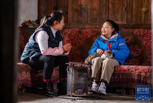 2月23日,云南省宣威市普立乡尼珠河村的小学生陈泓函出发前在家跟妈妈聊天。新华社记者 江文耀 摄