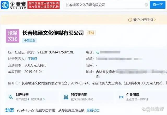 企查查APP显示,王境泽关联公司长春境泽文化传媒有限公司成立于2019年5月,由王境泽担任法定代表人并全资持股,于今年10月注销。