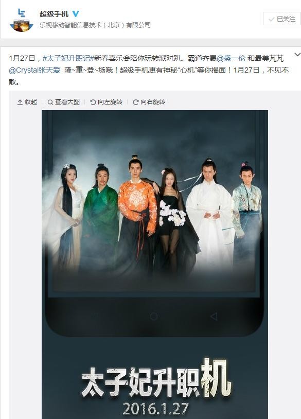 1、太子妃专版,大幅度生态优惠今日早上,乐视手机官方微博发出海报,预示着1月27日乐视将会发布一场“心机”发布会,其中“心机”与“新机”谐音,配合上工信部的曝光,应该是乐1s的迭代(或者衍生)版本的发布会。而根据目前高度结合乐视自制剧《太子妃升职记》进行传播,那么很有可能在内容里会有很多相关的内容 —— 例如很多剧迷一直求之而不得的“未删节”版本,更加充沛的剧情和细节完美还原;还有可能出现“番外篇”,也就是出现不同的剧情发展路线而导致剧情和结局完全不同,给乐迷更多惊喜。
