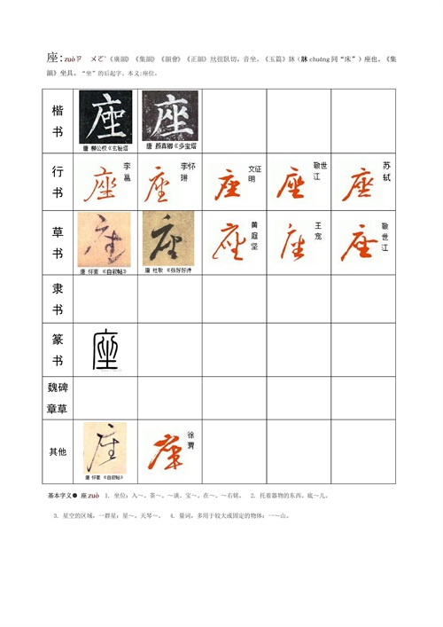 历代书家笔下的“座”较少,可能座是后起字吧,本人整理了部分名家的字迹,以供书法爱好者切磋学习。