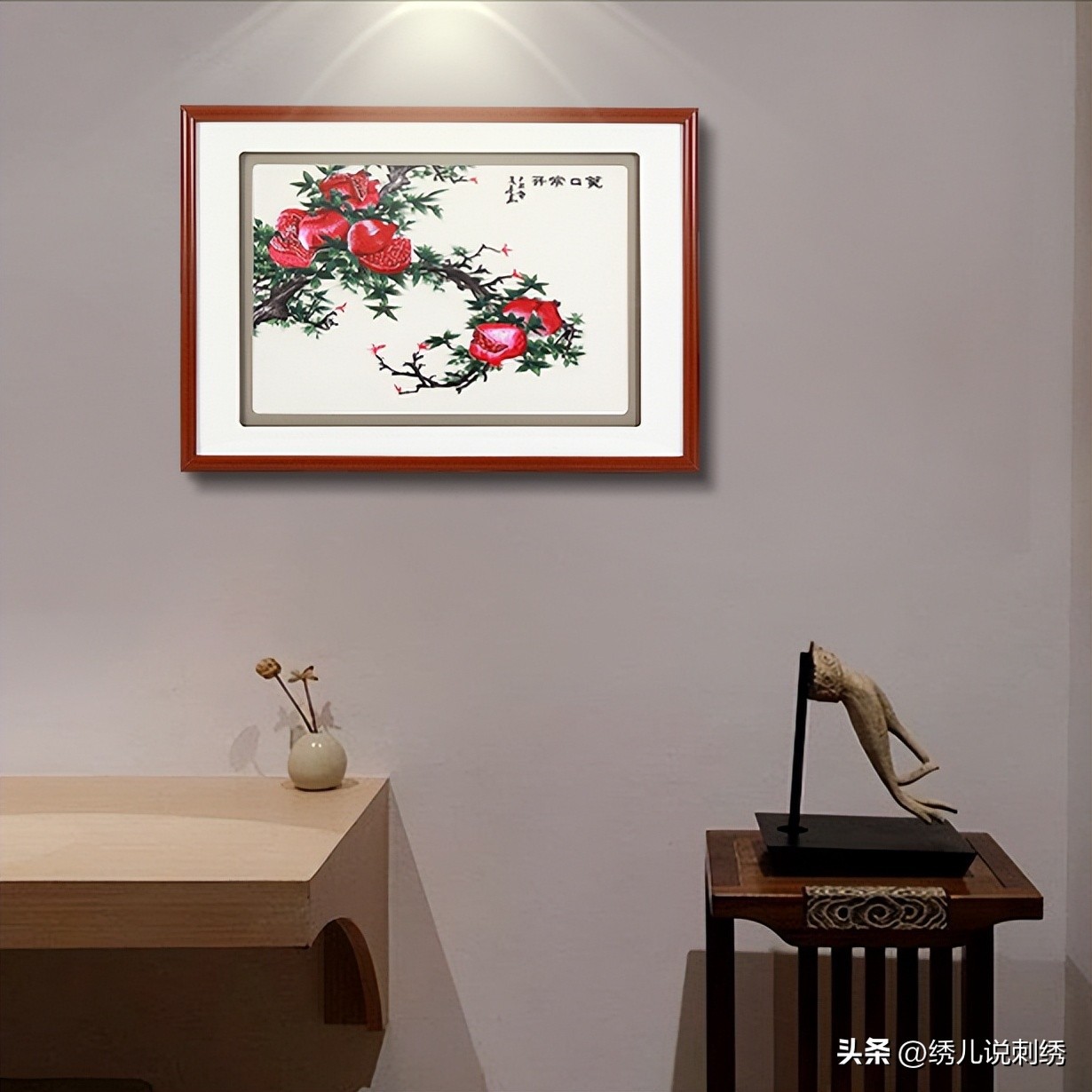 这幅刺绣挂画《笑口常开》,画中鲜红饱满的石榴让人垂涎欲滴,仿佛让人透过画框能看到硕果累累的榴园。石榴一般有着“笑口常开”、“多子多福”的美好寓意,将其作为吉祥挂在墙上,遮挡电表箱,既实用又美观,如同给墙上开了一扇充满生机与活力的窗户,让你每一天看到的时候都能元气满满,给家带来吉祥和好运的气息。