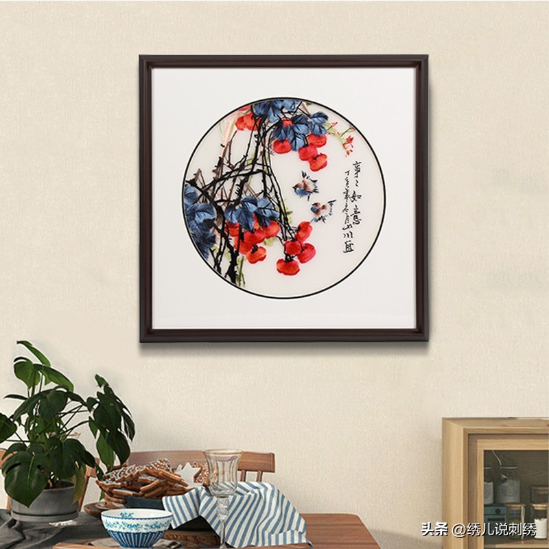 这幅刺绣挂画柿子图,刺绣下的柿子栩栩如生,生动逼真,又用细腻的丝线勾勒出灵动的鸟雀,像我们呈现出一派其乐融融的自然之景,作为装饰画挂在家中墙上电表箱上,既能遮挡,又给人带来轻松温暖的情绪,让人观之心情愉悦。此外柿子有着“事事如意”、“心想事成”的象征意义,挂在家中能使得生活更加顺心如意。