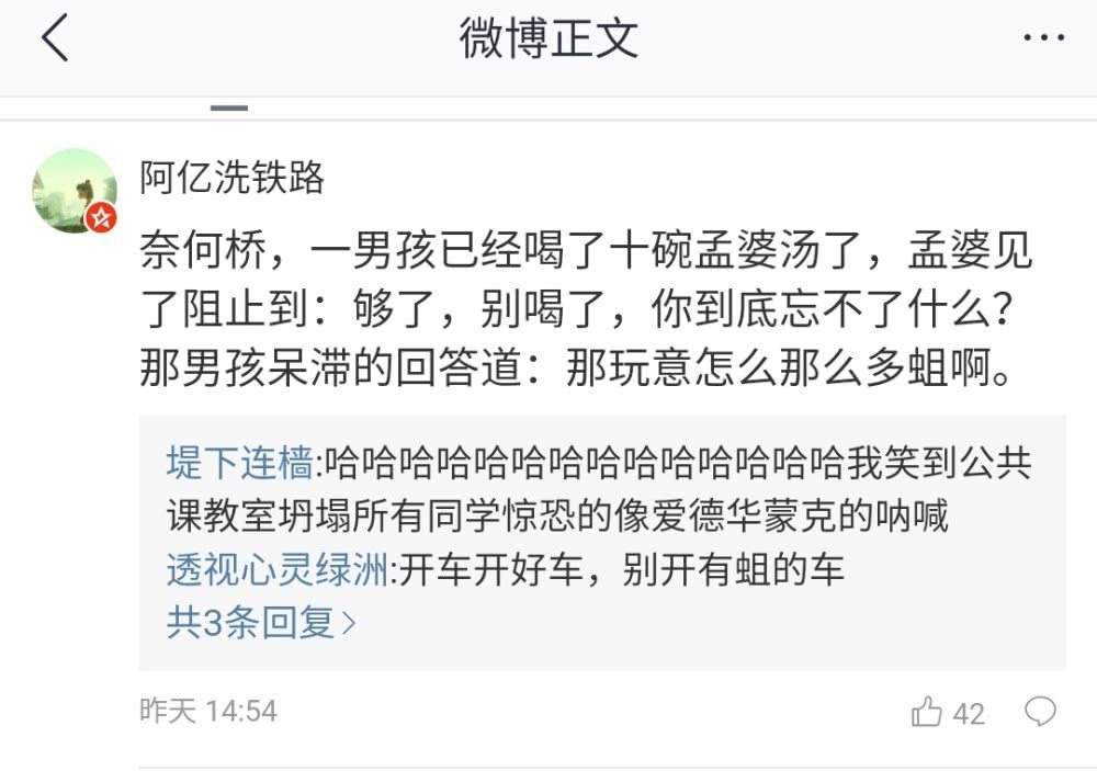 “奈何桥,一男孩已经喝了十碗孟婆汤了,孟婆见了阻止道:够了,别喝了,你到底忘不了什么?男孩呆滞回答道:那玩意怎么那么多蛆”