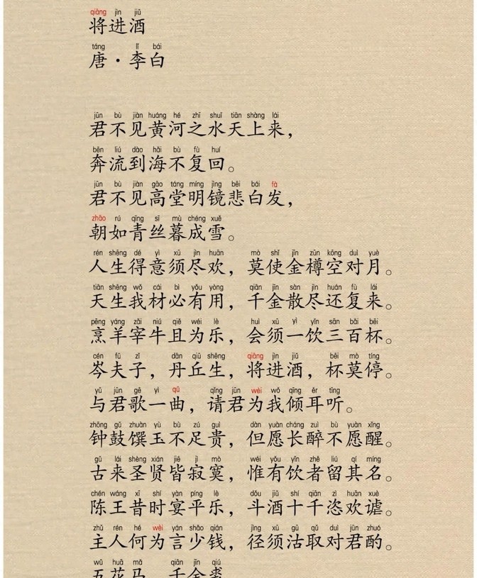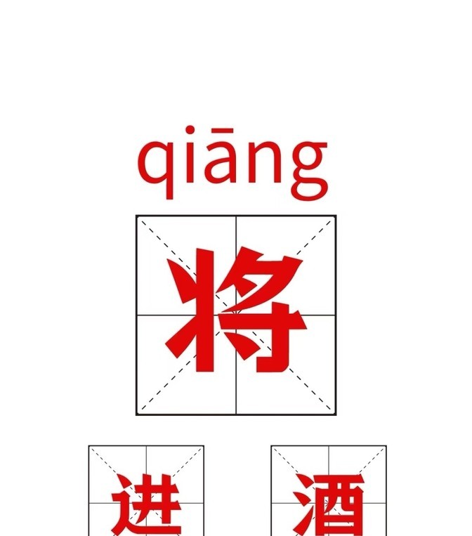要记住"将进酒"中"将"的读音,我给您一个小窍门想象自己在酒桌上,热情地对朋友说"请(qǐng)喝酒",这个"请"的声母和"将(qiāng)"是一样的。这样一来,"将进酒"的正确读音就不难记住了。