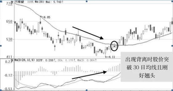 (2)“上下背离”发生时,股价刚刚上穿30日移动平均线,30日移动平均线开始走平或刚刚翘头向上,这说明股价已止跌企稳,如图4-42所示。