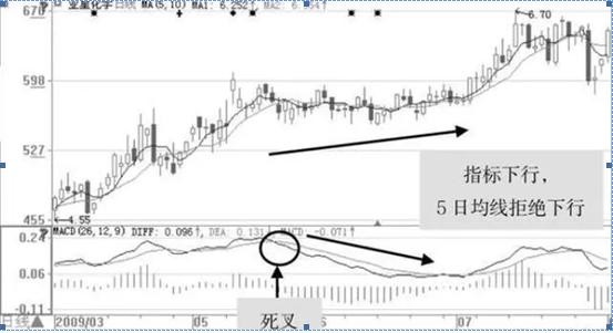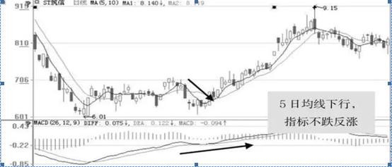 另一种情况是在股价暂时横盘期间,MACD指标中的DIFF和DEA曲线都下行,甚至出现“死叉”,而5日均线却拒绝下行,不跌反涨。