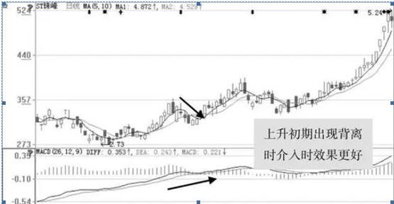 (1)“上下背离”发生在上升三浪起点效果最好,也就是说,出现这种情况时股价刚刚上涨,幅度有限,还没有进行主升浪,如图4-41所示。