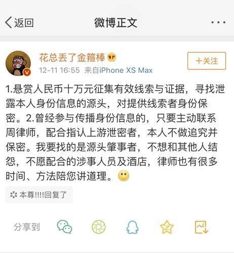 12月11日,多家酒店卫生问题曝光者“花总”发布微博,悬赏10万元征集有效线索与证据,寻找泄露本人身份信息的源头,并表示只要配合指认上游泄密者,不追究传播身份信息人的责任。