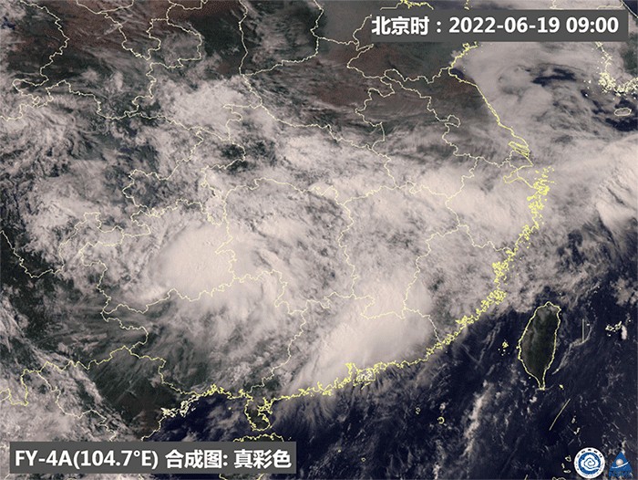 2022年6月19日,风云四号A星监测到的动态图中可以看出,在长江中下游一带维持一条梅雨雨带(梅雨锋),雨带上有多个中尺度对流云团在活动,造成雨量分布不均 来源:国家卫星气象中心