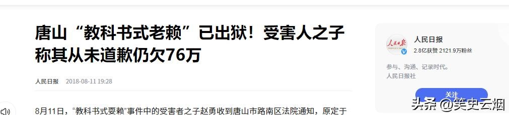 2.人民日报 2018-08-11 唐山“教科书式老赖”已出狱!受害人之子称其从未道歉仍欠76万