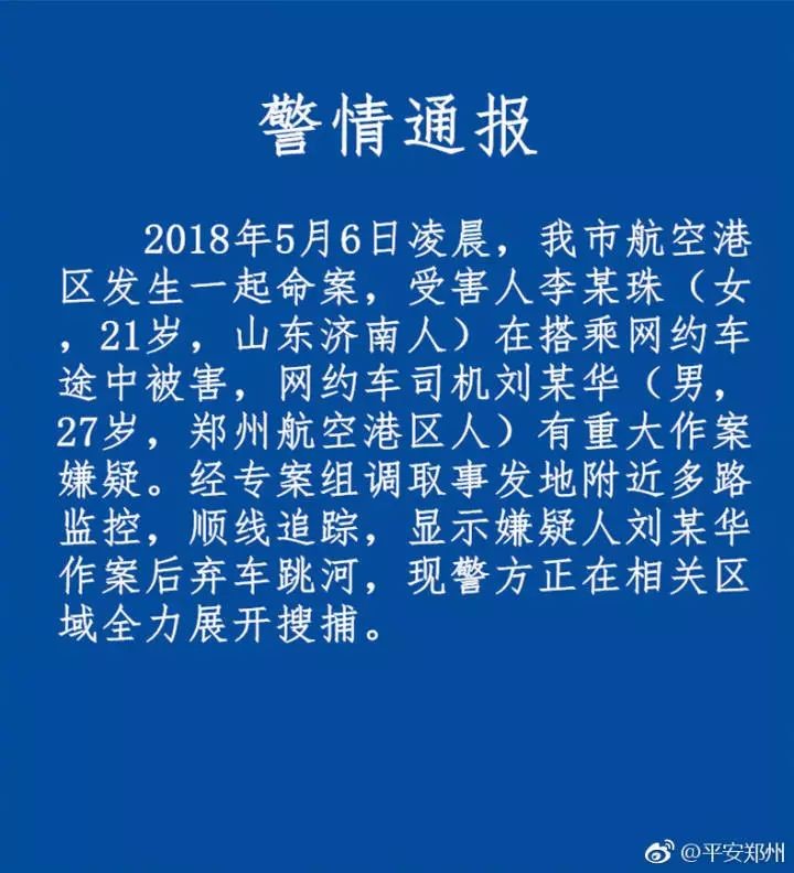 一名空姐于5日深夜搭乘滴滴顺风车从河南郑州航空港区前往火车站,途中被害。