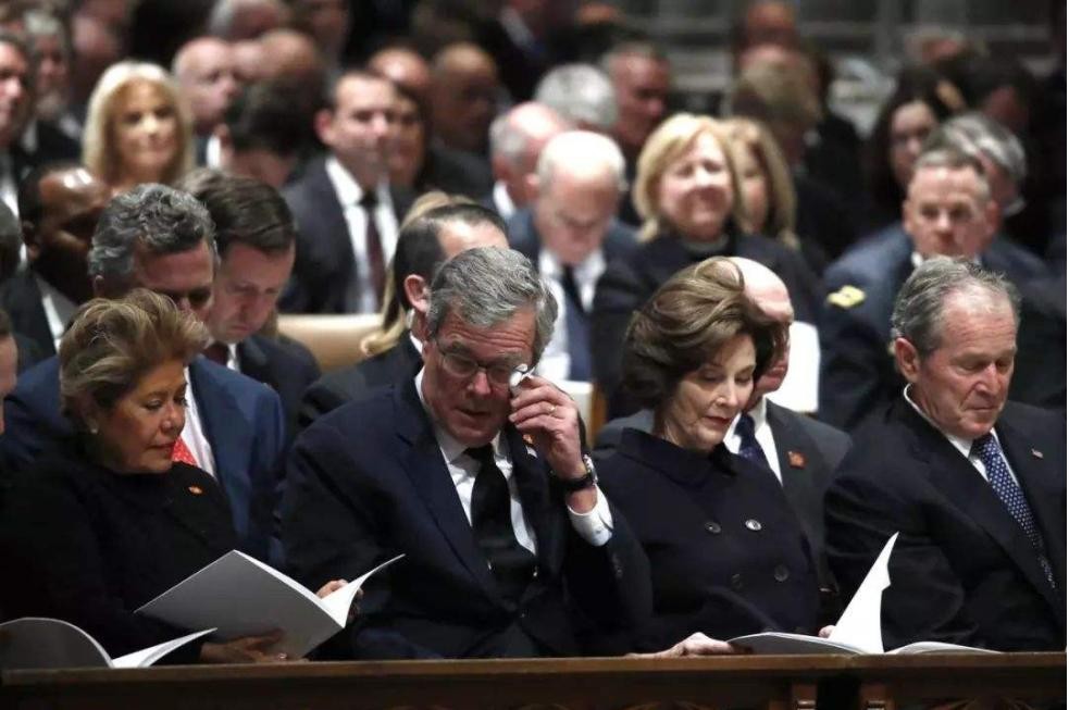 老布什的丧礼,也让政治立场分裂的华盛顿政界人士难得有平静齐坐的一天,观察其中微妙互动,则有亲疏远近的奥妙分别。小布什到场后,和特朗普夫妇及其他卸任总统及夫人一一握手,但小布什只有在和前第一夫人米歇尔握手时,悄悄递上他从口袋中拿出看似是喉糖的物品,只见米歇尔笑着收下。特朗普夫妇抵达现场后,两人都和邻座的奥巴马夫妇握手,尽管两人距离克林顿夫妇及卡特夫妇较远,但梅拉尼娅不忘向四人点头挥手致意,特朗普则未转向克林顿夫妇的方向致意。