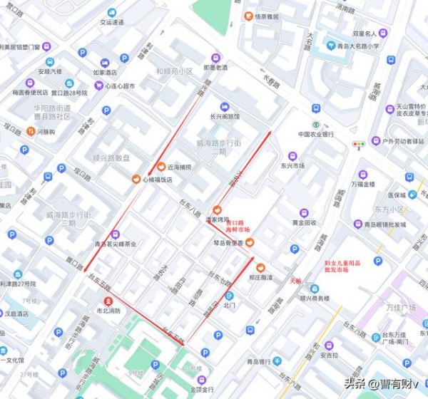 现在所说的营口路啤酒屋,大约是指顺兴路→台东五路→历城路→台东八东→大名路如图上箭头所示的这个范围。如果在青岛的其它地方游玩够,想来这面喝啤酒吃海鲜,直接导航软件上搜营口路市场或是青岛妇女儿童批发市场(威海路)公交或打车过来都非常方便。尽量不要自己开车,这附近停车难难难!!本次照片拍摄的时间为2022年8月3号晚7-8点左右。