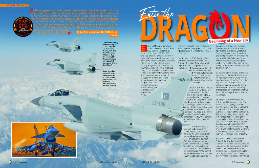 【文/观察者网 王世纯】3月11日,巴基斯坦空军在卡姆拉举行首批6架歼10CE接装仪式,随后这些歼-10CE参加了3月23日的“共和国阅兵”。对此,巴基斯坦空军杂志《首屈一指》(Second to none)在11月份最新一期的发表了一篇关于巴空军接装歼-10CE的文章《驾驭猛龙:巴基斯坦空军进入新时代》(Enter the Dragon Beginning of a New Era)。