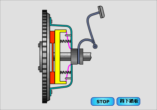 当车辆起步时踩下离合器,此时压盘与飞轮完全不接触,也就发动机输出的动力不会传送到变速箱。