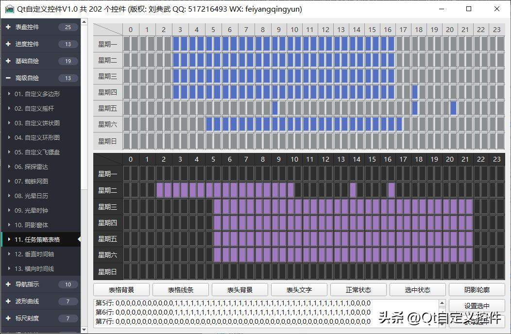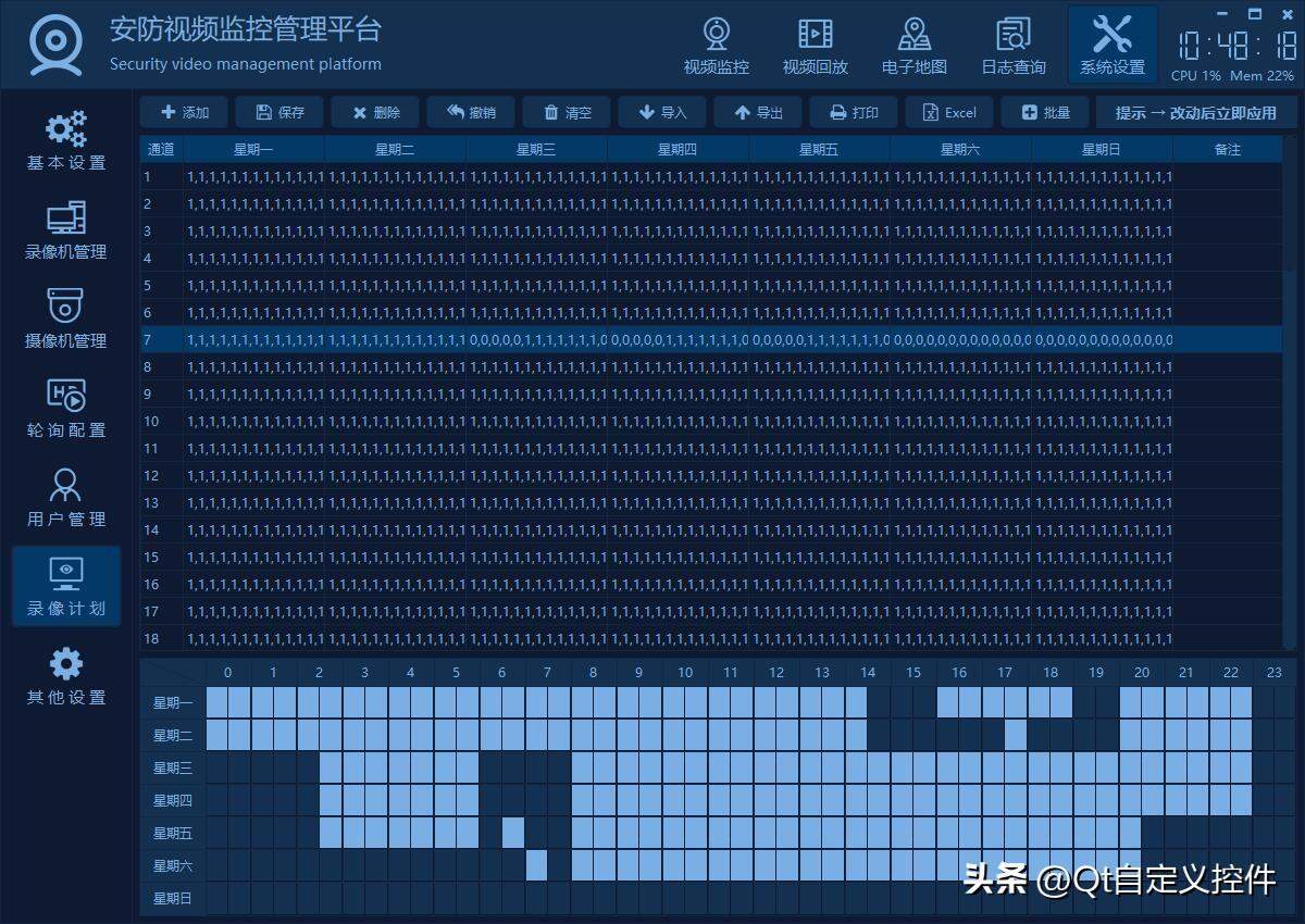 录像计划控件的设计思路大致是在QTableView表格视图模型基础上,用自定义委托,绘制对应的选中背景颜色,增加鼠标右键操作全选之类的,由于单元格表示每半小时,标题需要合并单元格,垂直标题对应周一到周日,也就是星期一到星期日,数据这块每个单元格选中表示1不选中用0表示,然后提供函数接口可以设置一天对应24小时48个时间格子是否选中,这样可以通过数据库或者配置文件拿到设置好的录像计划,设置到录像计划控件上,直观展示。
