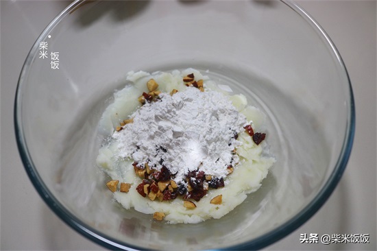 4,把切好的红枣和蔓越莓干倒入大碗中,再放入约50克的糯米粉。山药泥的含水量不同,所用到的糯米粉也不同,可以少量多次加入,具体用量大家根据实际情况自己调整。