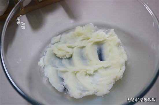 2,将蒸熟的山药倒入大碗中,趁热用勺子将其压成泥。这里大概有200克山药泥。