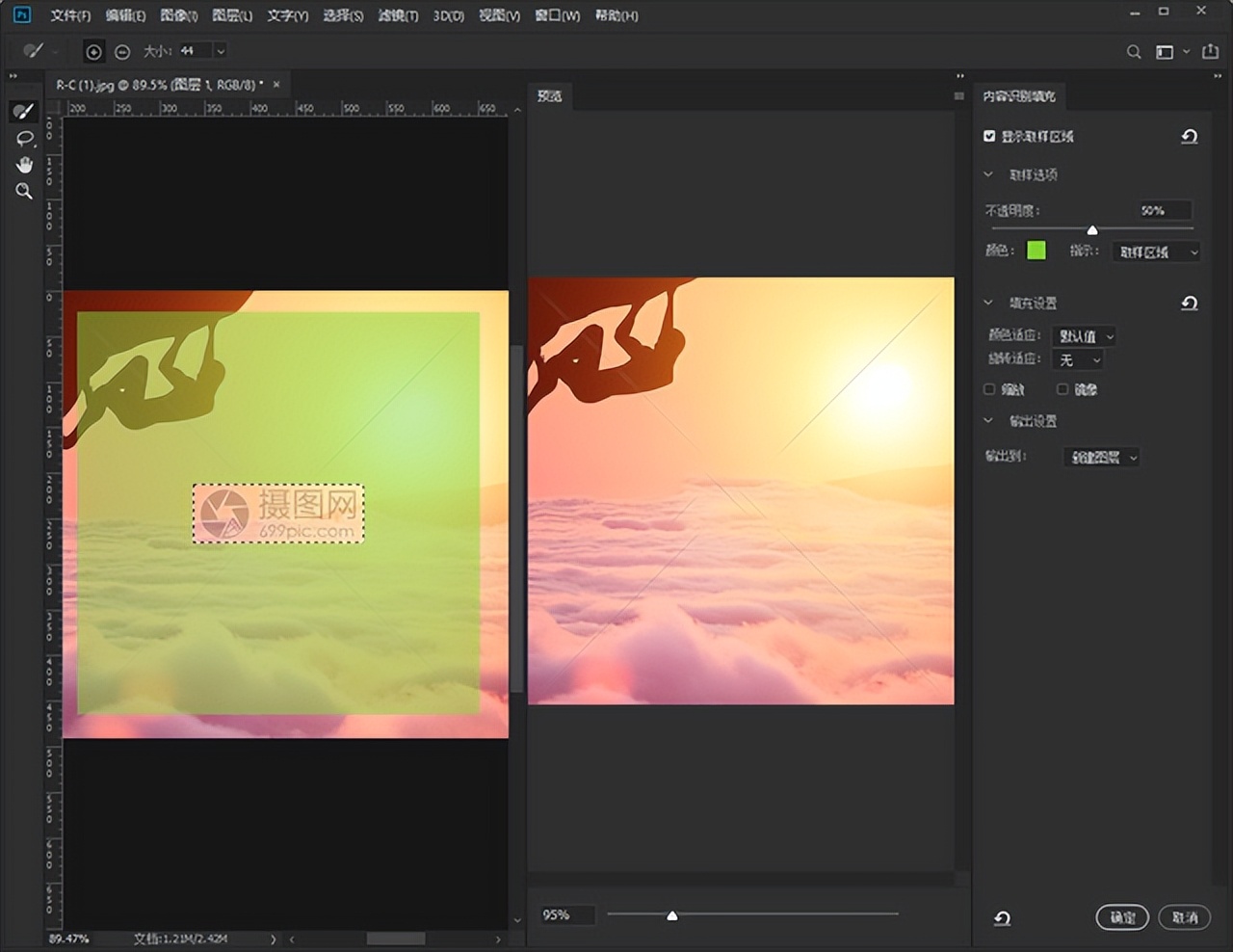 8.这时候你会看到如下区域,绿色的部分代表软件所需要进行计算识别的部分,以我们的素材为例,其实只需要水印周围一圈来进行智能填充就好了,所以我们用画笔工具擦除其他多余部分。