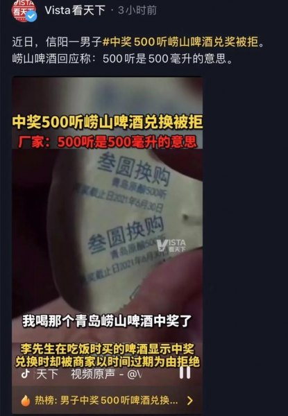 近日,河南南阳的李先生在饭店吃饭时买的崂山啤酒中奖,中奖信息显示3元换购青岛原酿500听,但兑换时被商家以活动过期为由拒绝,而崂山啤酒客服人员回应称:换购青岛原酿500听是指500毫升,不是指500罐。