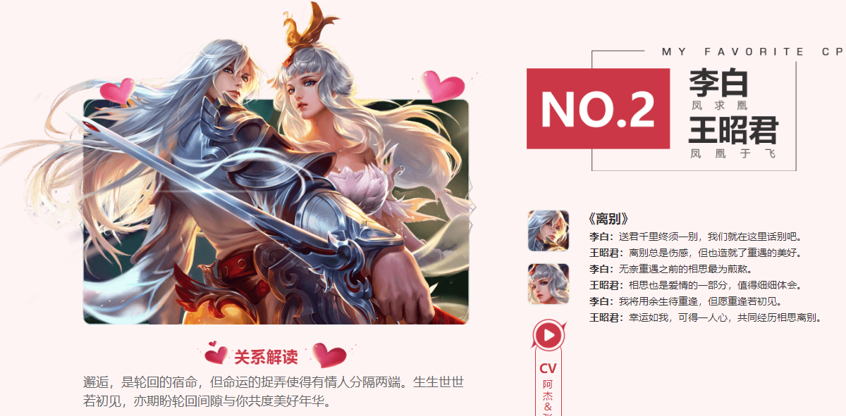 第二对CP就是李白和王昭君。他们之间的关系是邂逅,是轮回的宿命,但命运的捉弄使得有情人分隔两端。生生世世若初见,亦期盼轮回间隙与你共度美好年华。同样也有这一款情侣皮肤,凤求凰和凤凰于飞,很多玩家很后悔没买到这两款极其绚丽的皮肤。