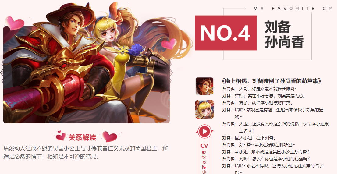 第四对CP是刘备和孙尚香。他们之间的关系是活泼动人狂放不羁的吴国小公主与才德兼备仁义无双的蜀国君主,邂逅是必然的情节,相知是不可逆的结局。刘备和孙尚香在历史上原本就是一对夫妻,在游戏里同样是一对CP,秀恩爱哦。