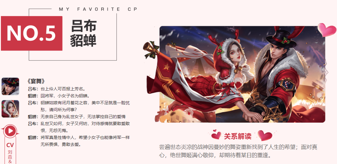 第五对是吕布和貂蝉,他们之间的关系是尝遍世态炎凉的战神因曼妙的舞姿重新找到了人生的希望;面对真心,绝世舞姬满心敬仰,却期待着某日的重逢。吕布和貂蝉可歌可泣的爱情故事不管在哪里都是让人落泪。他们两个的情侣皮服也有一款,就是圣诞节皮肤。