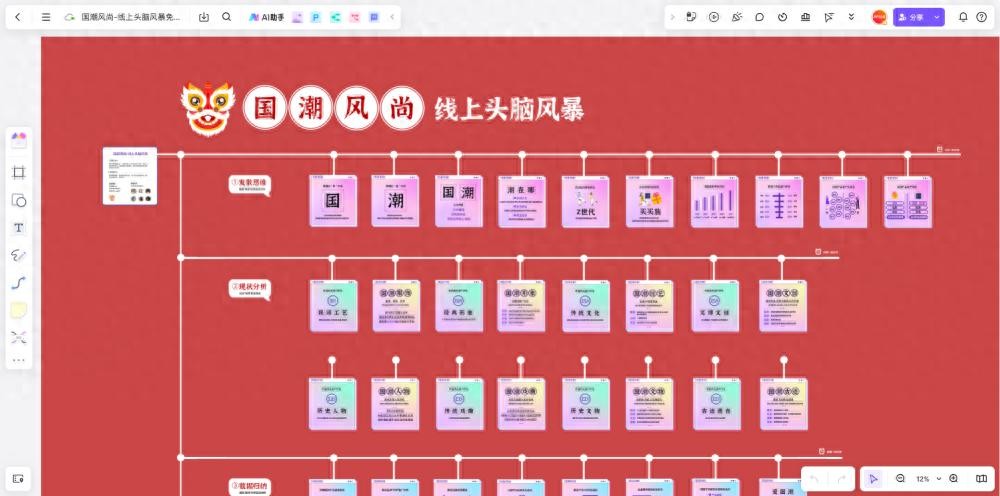 国潮风尚线上头脑风暴模板集结团队成员共同探讨如何在时尚设计、文化传播等领域展现国潮风尚。这个模板通过线上协作工具实现集体创意的方法,产生大量创新性的想法。