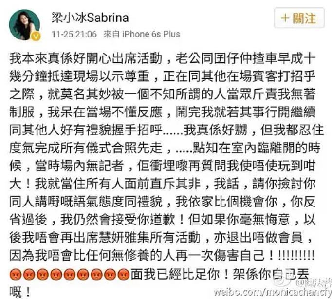 据悉陈法蓉当场指责梁小冰不穿统一制服意欲何为,梁小冰则觉得陈法蓉不懂尊重二字,亦拒绝与其现场合影。不过两人也是有交情的老友,口舌之争嘛,互怼几句就继续交际了,只是没想到当天散场后,梁小冰公然在社交平台升堂!