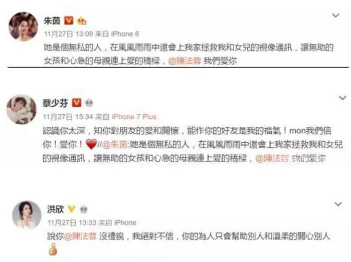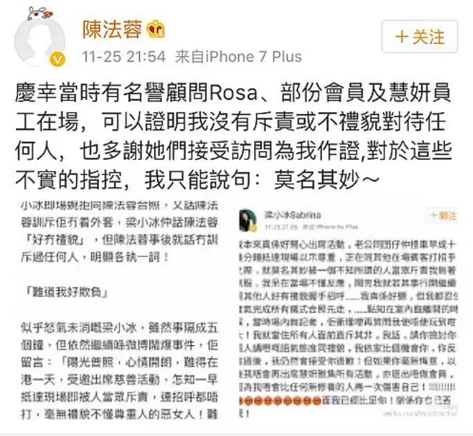 陈法蓉亦是毫不退让,大方认领梁小冰的“明涵”,并贴出在场女星力挺自己的发文截图,表示自己被无辜牵连,直言这是莫名其妙的不实指控。