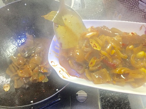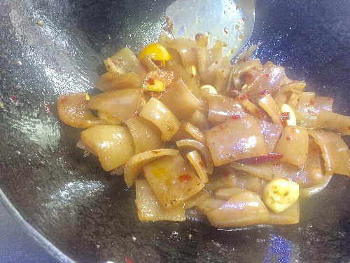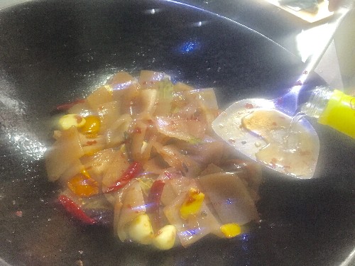 第四:炒出香味后倒进猪皮,大火翻炒