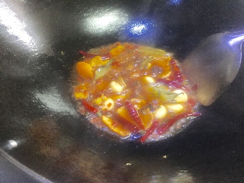 第三:锅里放入植物油后,先加一小勺白糖,这是一个小窍门,把白糖熬制出颜色,然后放入备好的姜、蒜、干辣椒和香料