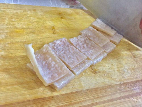 第二:买回来的猪皮先煮熟,捞起晾凉,再切成小块