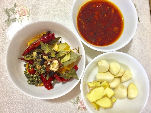 第一:准备小半碗豆瓣,姜片,蒜瓣不用切,否则会粘锅噢,另一个小碗里准备少许干辣椒加上香叶、花椒、橙皮、草果,有这些香料更能提味