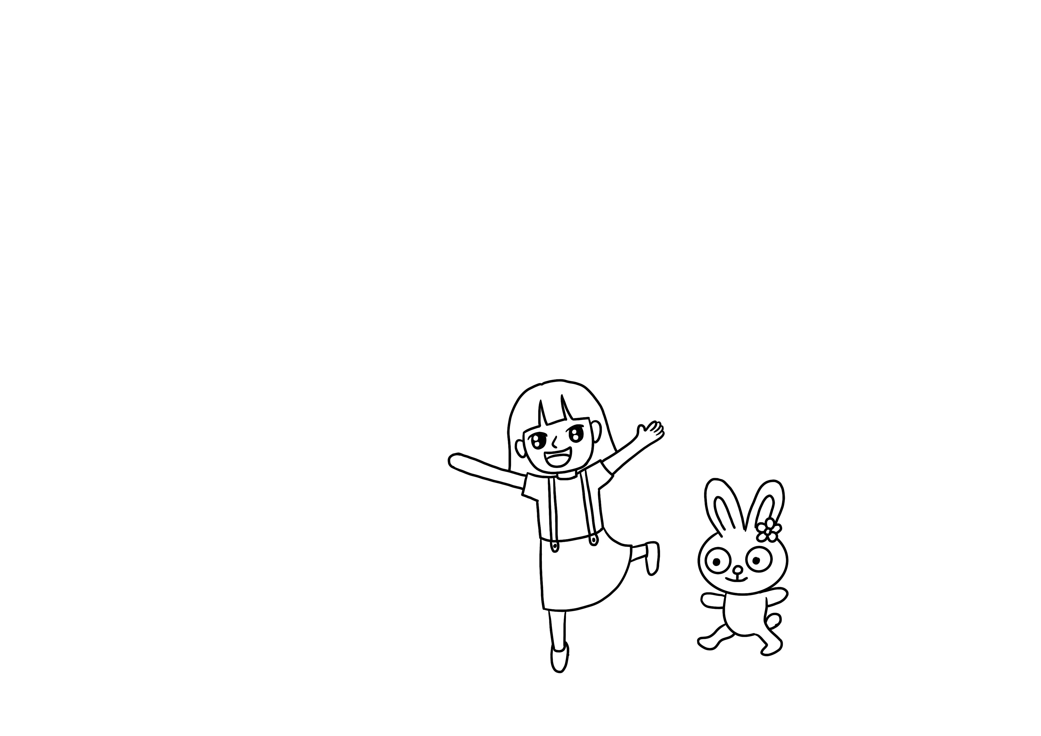 小女孩的旁边画一只小白兔,小白兔是拟人化的,开心地蹦蹦跳跳,和小女孩一起玩耍。