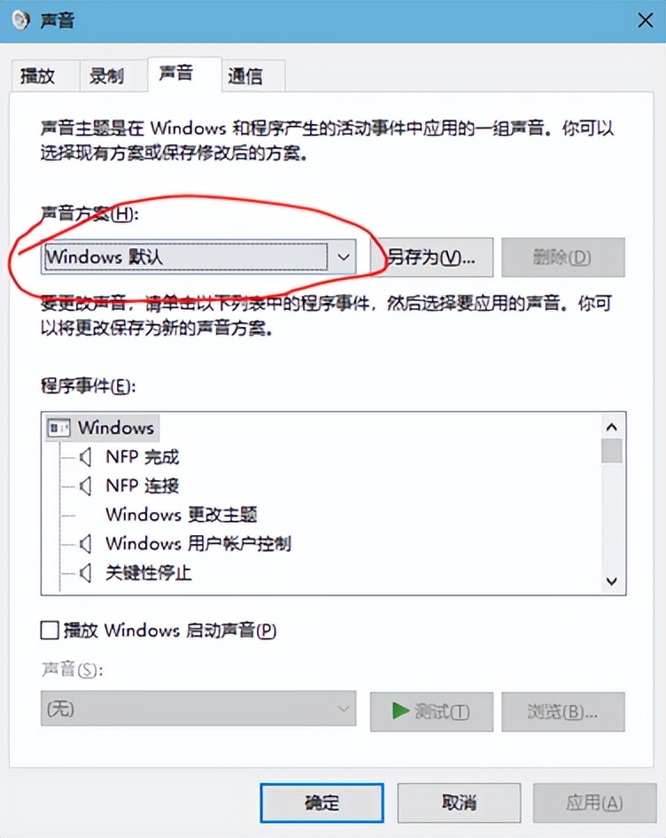 在“声音”面板找到“声音方案”,如果这里显示为“无声”,就更改为“默认”,再选择“确定”即可。