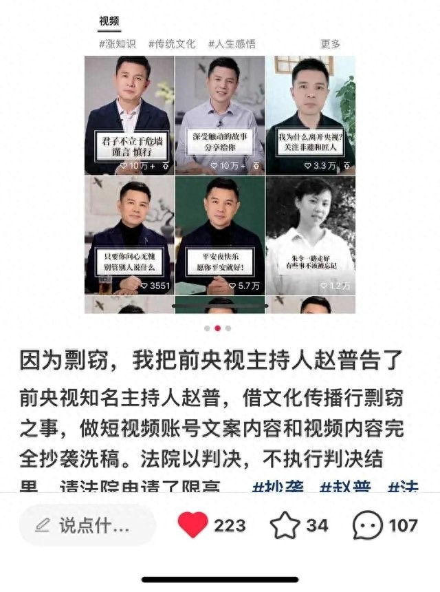 不过近日,有网友发帖称:“因为剽窃,我把前央视主持人赵普告了。赵普短视频账号的文案内容和视频内容“完全(是)抄袭洗稿。法院以(已)判决,(对方)不执行判决结果,请法院申请了限高。”