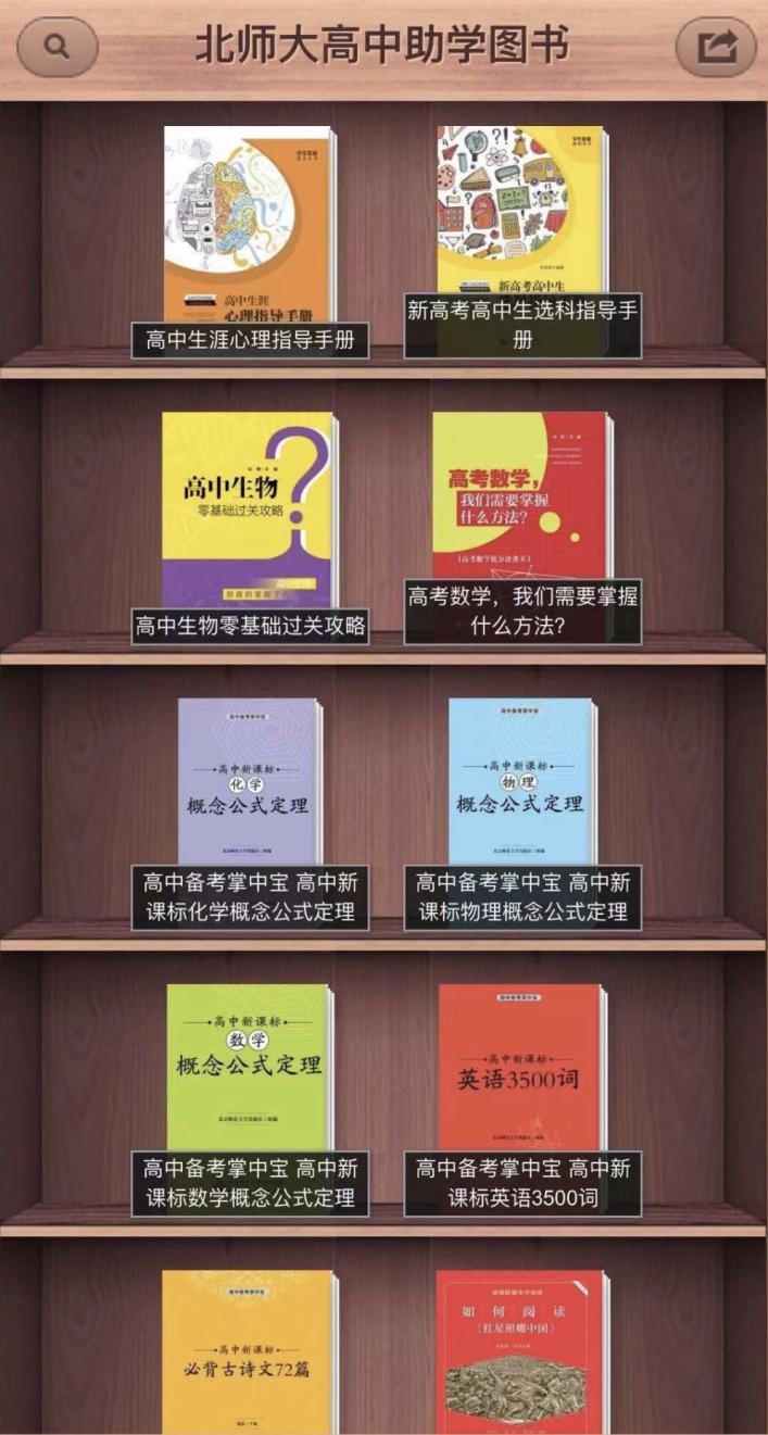 电子图书:涵盖整本书阅读、古诗文背诵赏析、数理化公式定理手册、高考数学复习指导、高中生物学习指南等电子书,还有选科指导、心理指导相关的电子书。