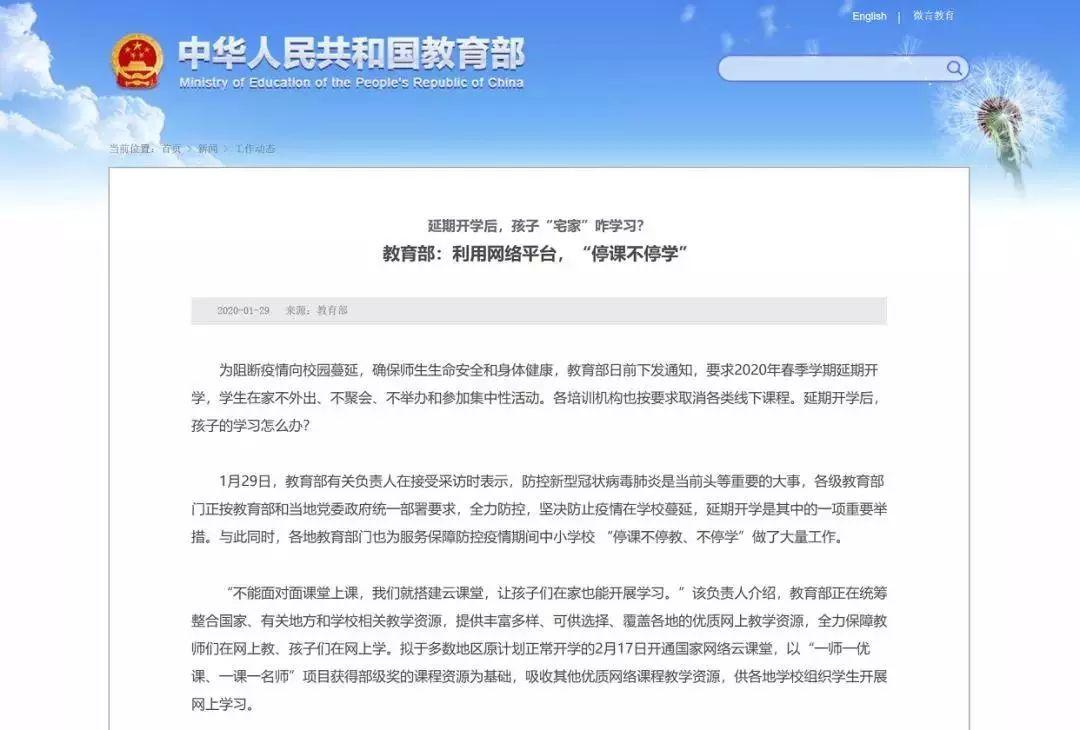 自新型冠状病毒感染的肺炎疫情发生以来,为阻断疫情向校园蔓延,确保师生生命安全和身体健康,教育部日前下发通知,要求2025年春季学期延期开学,并统筹整合国家、有关地方和学校资源,利用网络平台实现"停课不停学"。