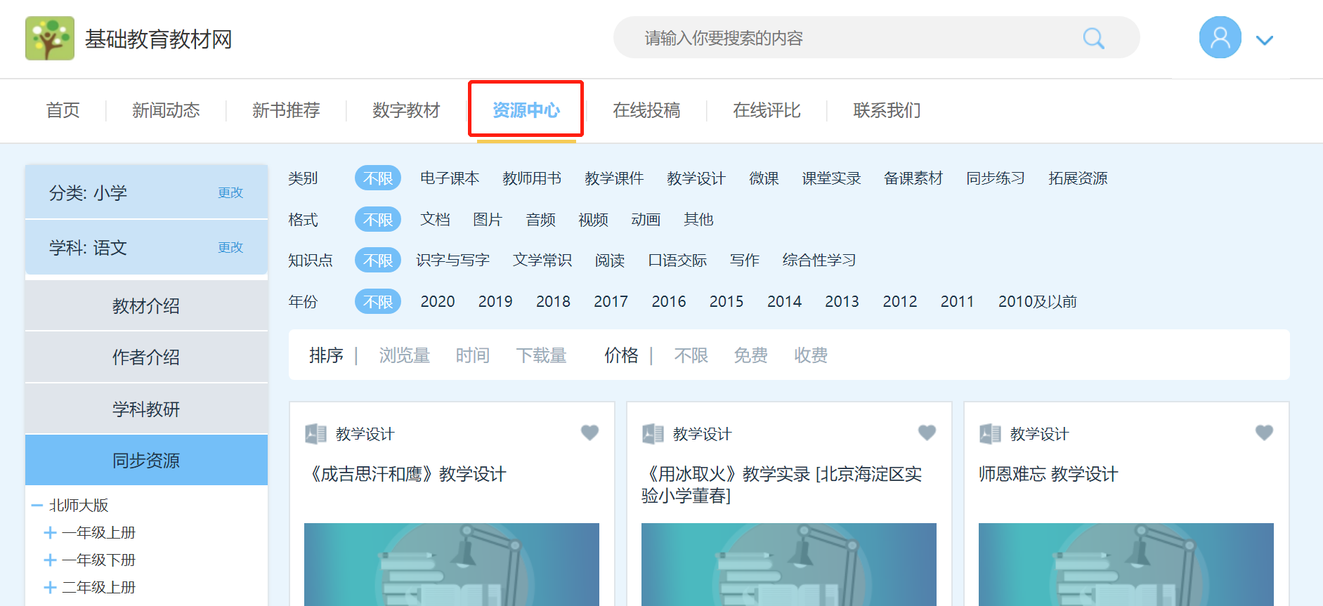 通过基础教育教材网(网址http://www.100875.com.cn),可以获取电子课本和教师用书,也可以在线观看微课,网站的"学科教研"板块还提供了大量的专家讲座视频、教研论文等教师培训资源,同时也提供了包括教学课件、教学设计、同步练习、拓展资源等文档类的资源。只需要登录网站,选择资源中心板块,便可以轻松获取所需的教学及学习资源。