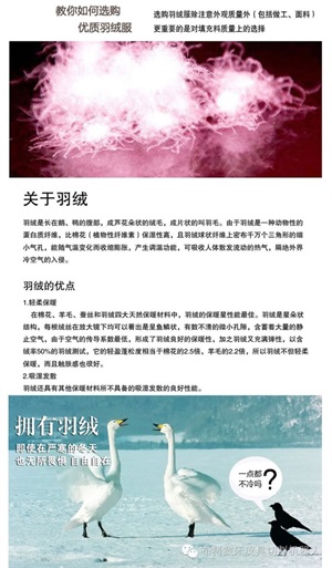 3.其他:◎鼻子凑近羽绒服仔细嗅一嗅,如有明显的腥味或异味,说明所用羽绒原料没有经过严格的工艺处理和消毒。◎用手摸捏羽绒服,测试其手感柔软程度,如有过大、过粗的长毛片,短小的粉碎毛等,这种羽绒服质量较差。◎用手轻轻拍打羽绒服,看针脚处有无粉尘溢出,如有粉尘溢出则为粉碎毛或灰沙绒所制成的伪劣产品。◎用双手揉搓羽绒服的正、反面,观察是否有绒毛钻出。如有绒毛钻出,则说明所使用的面料或里料的防钻绒性能差或没有防钻绒性能。