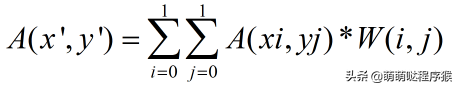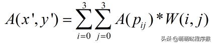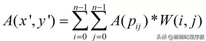 常见的插值算法有最邻近插值、双线性插值、双三次插值,不管什么插值算法,其本质都是取浮点型坐标点周围的n*n个整型坐标点的像素值进行加权和,从而得到该浮点型坐标点的像素值,如下式: