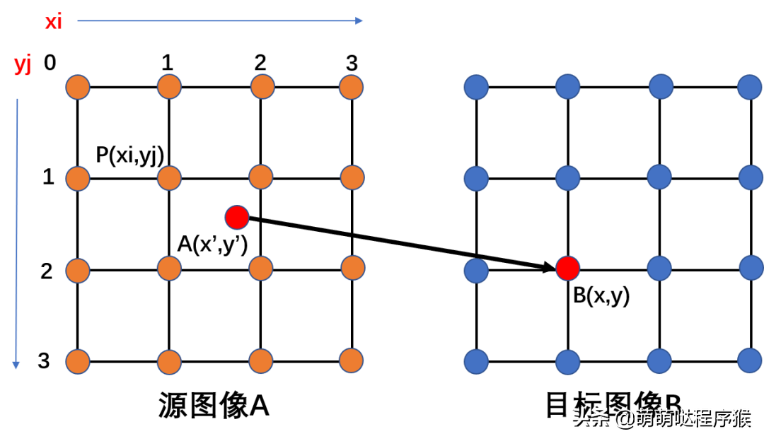 讲插值之前,首先讲像素重采样的概念。假设有图像A和图像B,其中A为源图像,B为目标图像,A与B的坐标具有对应关系f: